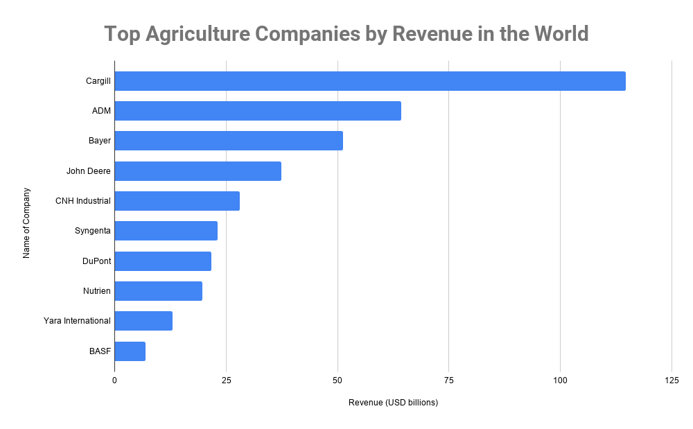 全球农业产业贡献2.4万亿美元,使得市场与世界上任何其他行业一样重要。由最大的前10名农业公司世界上2020年,全球农业市场在全球拥有超过十亿人。世界上最大的农业公司收入是嘉吉公司,引进1146.9亿美元去年。前3农业公司的ADM和拜耳。最大的食品需求的驱动因素是人口和收入,都在上升。到2050年,世界人口将达到91亿,从74亿年的2016。根据联合国,最好的农业公司必须增加粮食产量的70%到2007年的水平相比需要更大的人口。