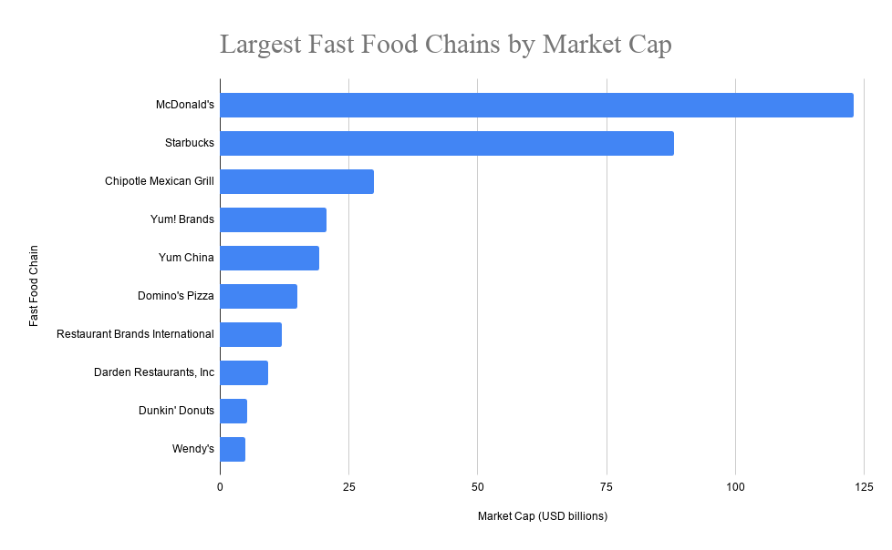 As younger generations continue to drive the industry forward due to high demand, the global fast food industry continues to flourish. The global fast food industry generates over USD 570 billion annually and is expected to grow at a CAGR of 5.1% by 2027. This immense growth is led by the top 10 largest fast food chains in the world consistently increasing revenues and market performance with stellar sales of their products. At the forefront of the evolving fast food industry are some of the top fast food chains in the world recognized for their branding and popular menu products known all over the world. Starbucks leads the way as the largest fast food chain in the world by revenue McDonald’s and Subway are number 2 and 3 ranked fast food restaurants in terms of revenue. This article will breakdown the top 10 fast food chains in the world by both revenue and market cap. Here are some key takeaways that will be discussed in the post: