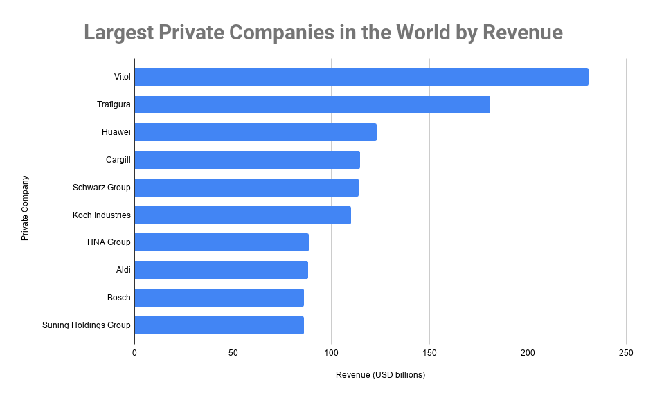 到2020年,按收入计算,全球最大的私营公司是Vitol;其次是托克和华为。这是BizVibe关于2020年全球收入排名前10大私营公司的文章。这篇文章还将深入研究世界上最大的私人公司,除了前10名。本文将提供对全球私营部门的深入了解,包括: