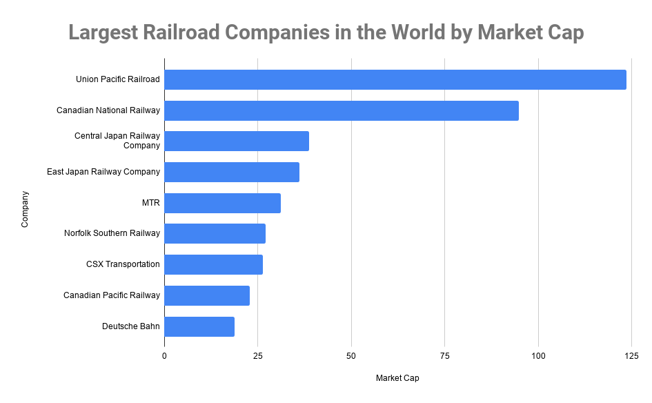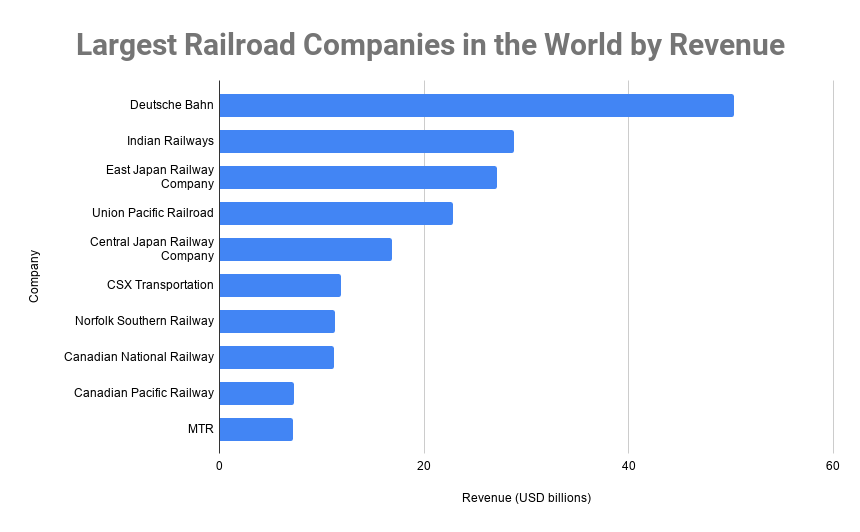 这是BizVibe列表排名前十位的世界上最大的铁路公司2022年市值和收入。这些领先企业革新的铁路行业2022年运行。