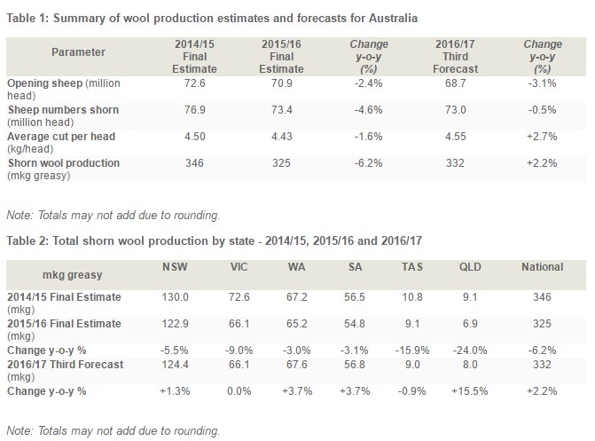根据澳大利亚羊毛生产预测委员会(AWPFC)的最新预测,在2016/17财年,澳大利亚的羊毛产量预计将增长到3.32亿公斤(mkg),比上一季增长2.2%。这一增长还表明,由于良好的季节条件和澳大利亚几乎所有主要绵羊产区的丰富饲料,平均每头羊毛产量增加了2.7%。